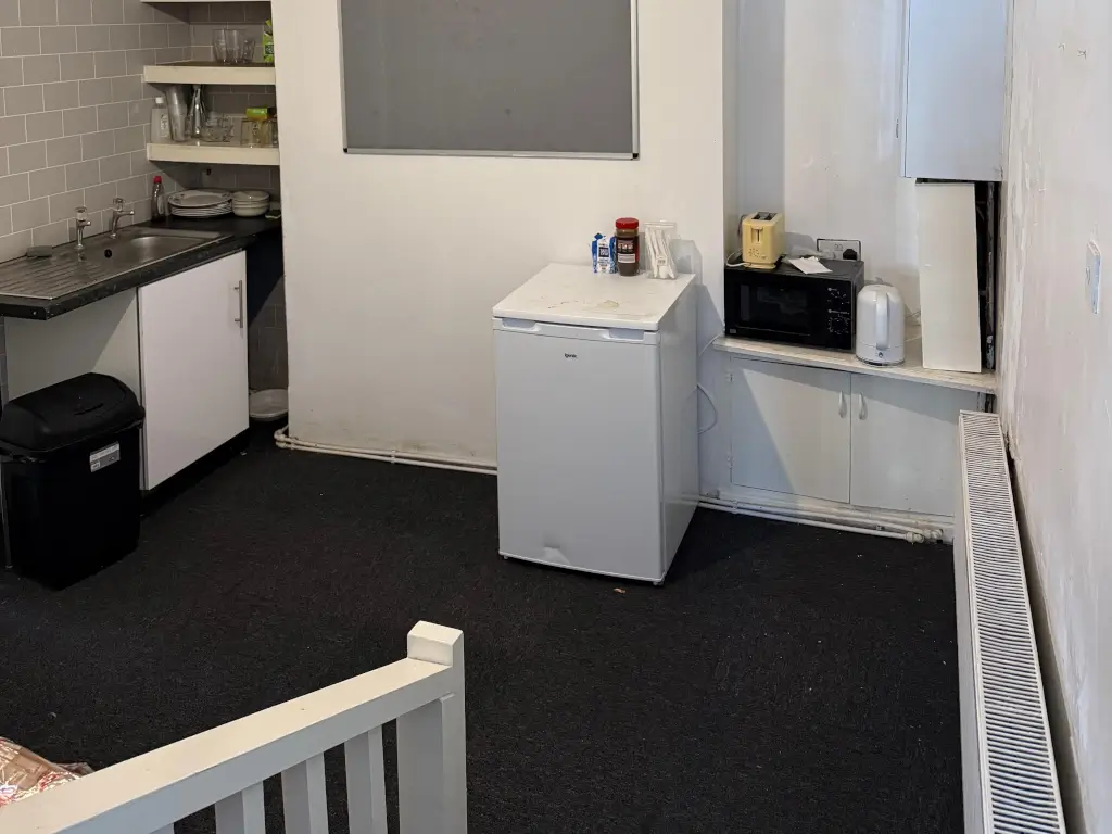 The spacious room can accommodate up to 30 people and includes a large conference table, 20 chairs, a whiteboard, a printer, three laptops, and a heater. A modern kitchen is available, complete with a refrigerator, kettle, microwave, and toaster. Additionally, the venue features a clean and well-maintained bathroom for your convenience.