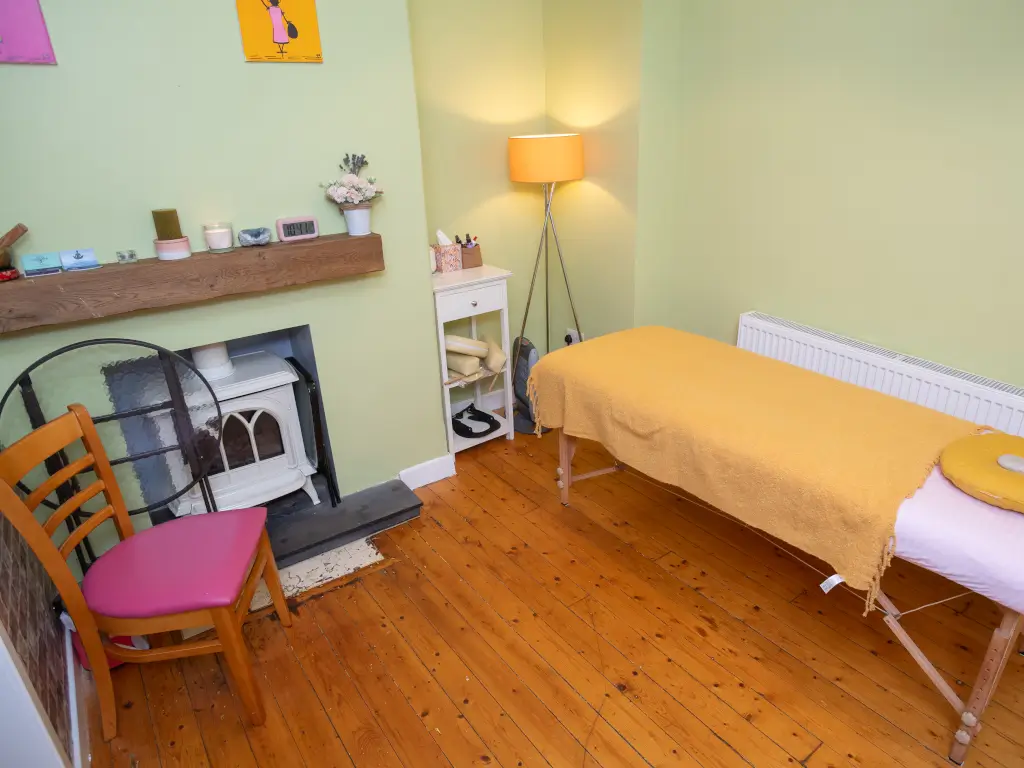 The room features a professional Klarfit MT 500 massage table. Its 10 cm thick fine cell foam padding ensures maximum comfort and muscle relaxation. The table’s 10-stage tilting backrest, removable armrests, headrest, and closable face hole allow for versatile massage positions.