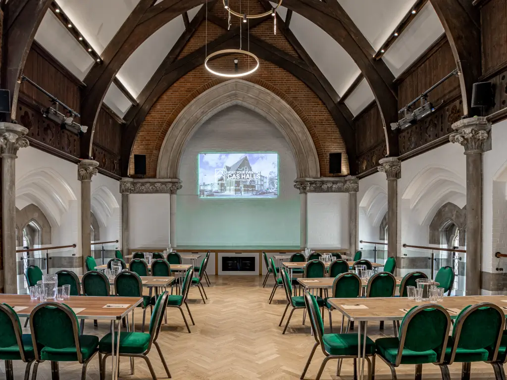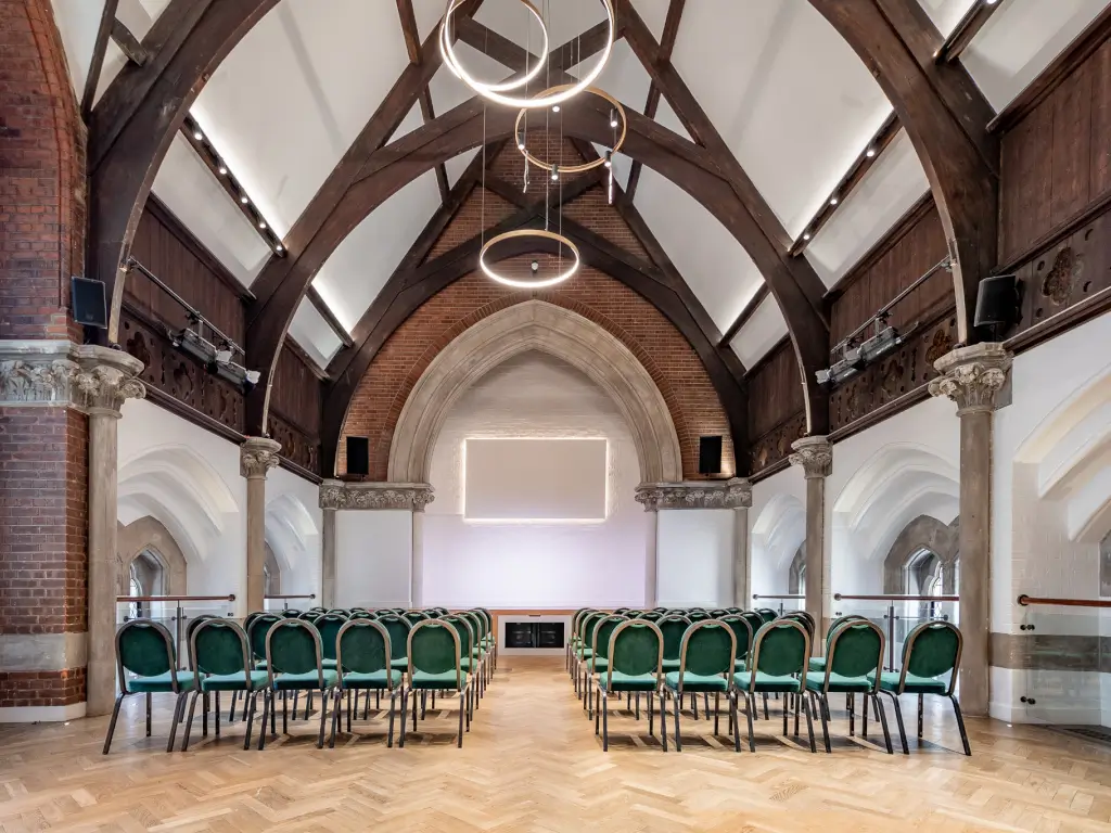 Located just a minute’s walk from Parsons Green Station, the Upper Hall is our most sought-after space for special occasions and events. With wooden floors, high ceilings, and original architectural details, it’s perfect for milestone birthdays, receptions, performances, and family celebrations. The hall features a raised stage, Bluetooth sound, dimmable lighting and signature green velvet chairs; everything you need to set the scene for a standout event.