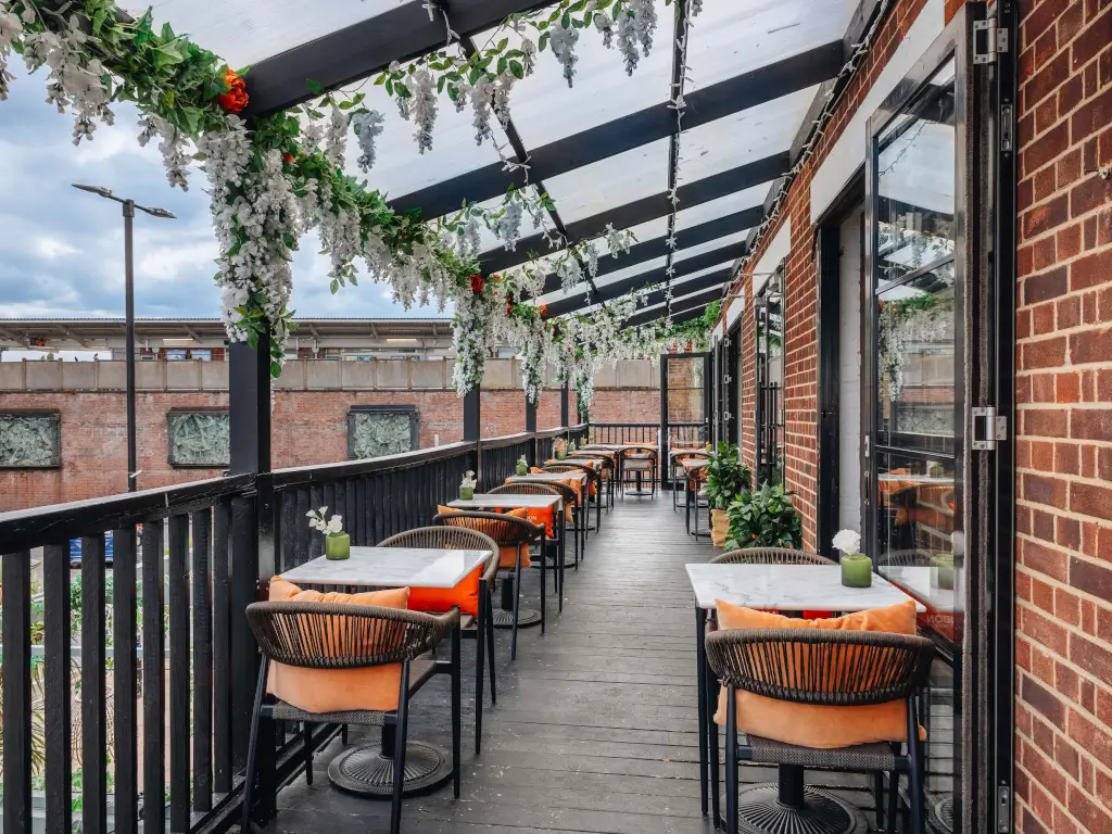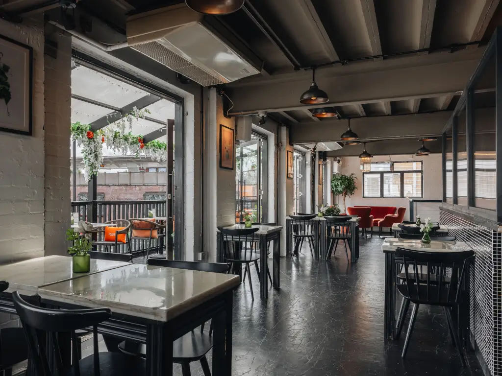 The Mezzanine at The Exhibit is a sleek, semi-private lounge area that wraps around the open kitchen and opens onto a large, covered balcony. With bi-folding doors that span the length of the room, it creates a seamless indoor/outdoor experience — ideal for cocktail and canapé parties, relaxed gatherings, or summer-style events with a touch of fresh air