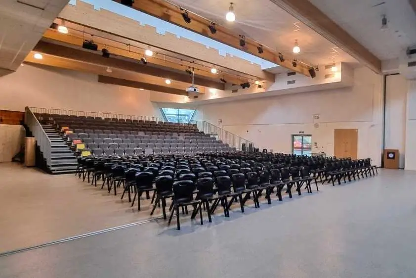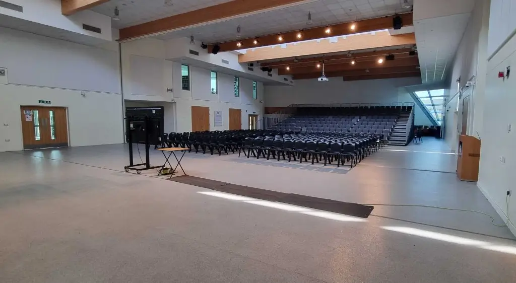 The school's main hall is a modern space with a wood flooring area as well as comfy tiered seating. This makes it versatile for use of all different activities from activity groups to churches.