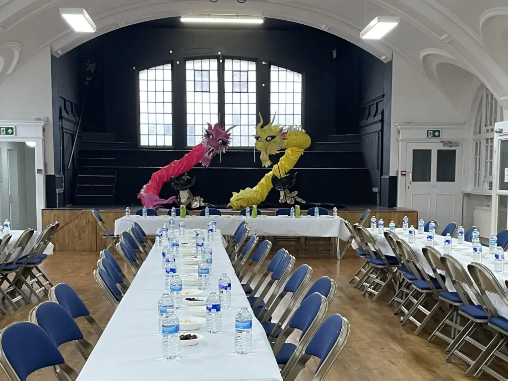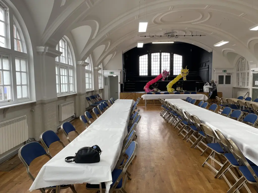 It can hold 150 people and it has beatiful architectural features. It also has a stage for performances and rehearsals.