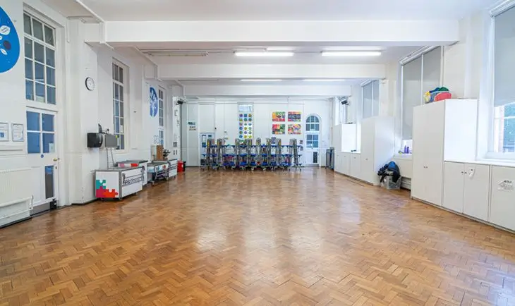 This primary school hall is the perfect space for a rehearsal, small religious gathering, talk or fitness group. There are also dining tables with chairs attached to each table available.