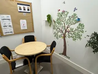 This cosy and private space is ideal for one-to-one meetings with parents, with or without children. The room is furnished with a single table and three chairs, offering a simple and comfortable setting for conversations, consultations, or support sessions.