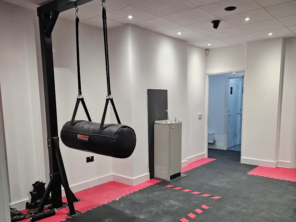 The space is lit by down lights, with one natural light window. It is also rubber matted and offers a selection frames to hang "punching bags" There is a water fountain and toilets.