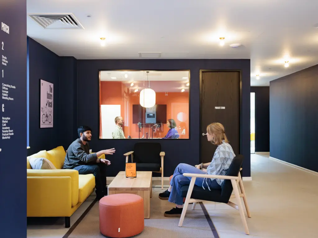 A vibrant, terracotta podcast studio, equipped with plug-and-play recording tech, perfect for hosting interviews, discussions, and sharing big ideas. Thoughtfully crafted for comfort and creativity, this design-led space offers everything you need to record and collaborate easily.