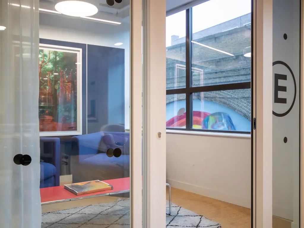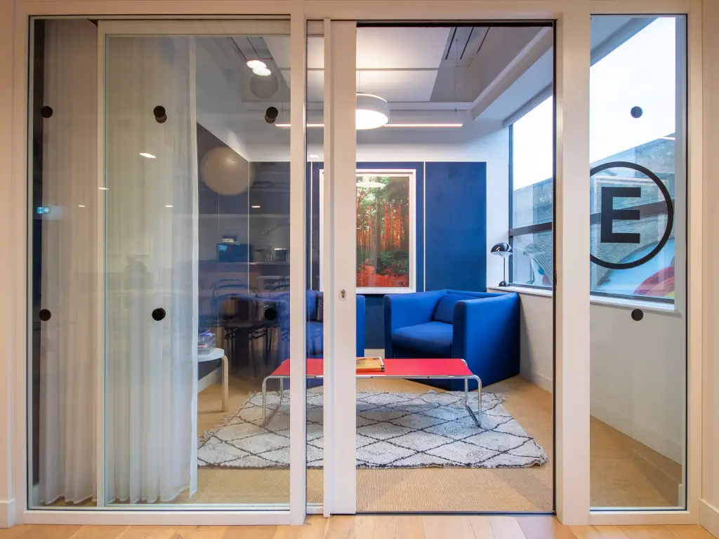 A cozy meeting room for two, featuring comfortable chairs and a coffee table. The nature print and outdoor views create a calm, welcoming atmosphere.