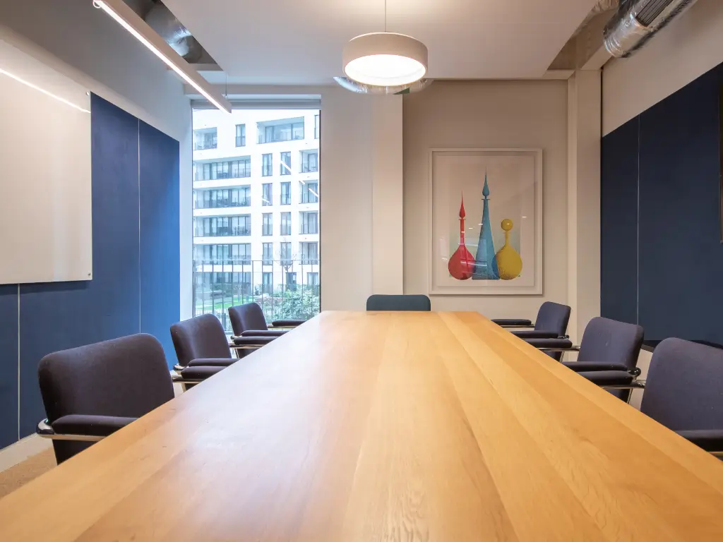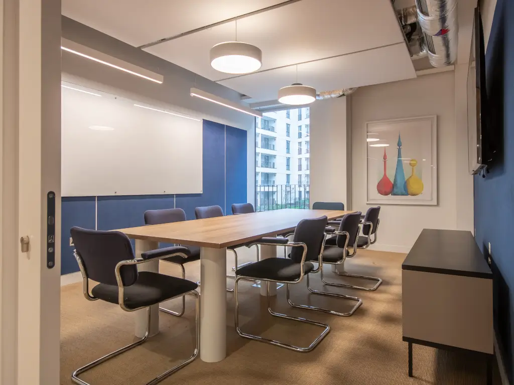 A calm environment with deep tones, featuring a wooden table and a wall-mounted screen for presentations.