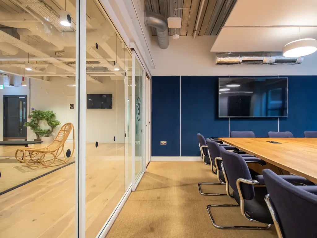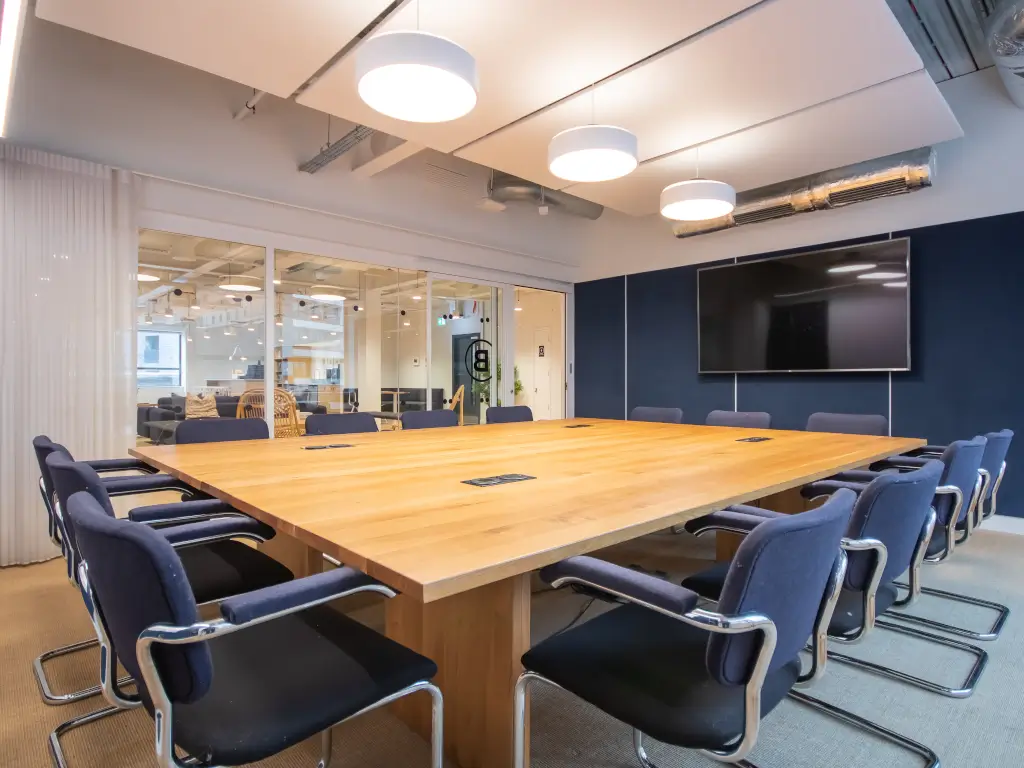Designed for 14 people, the room features a large wooden table, dark blue accents, and a clean, minimalist aesthetic. A large window fills the space with natural light, while the whiteboard and flat-screen TV provide a practical setting for presentations, brainstorming, and team collaboration.
