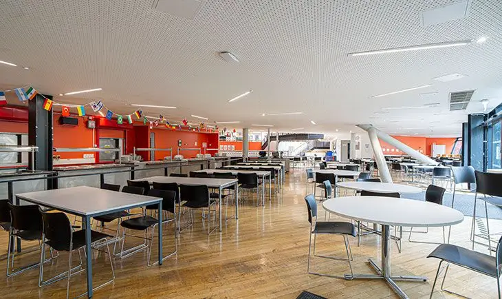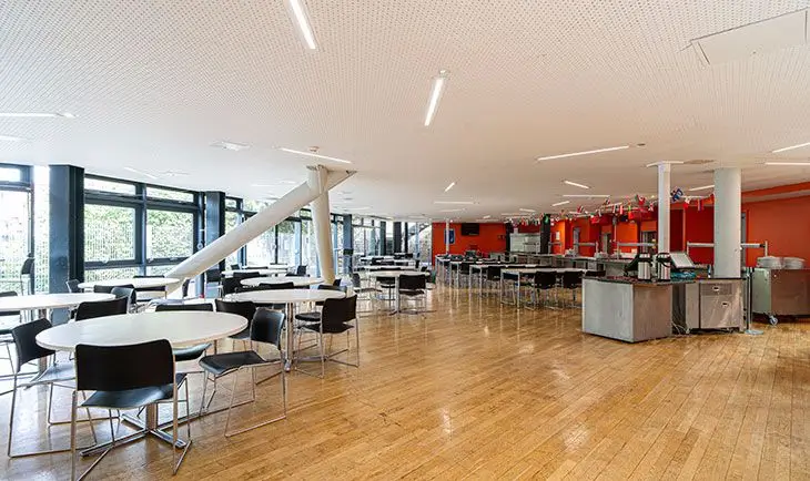 A spacious and comfortable open plan area with seating arranged in groups of six around canteen tables, providing a flexible and practical environment for any occasion.