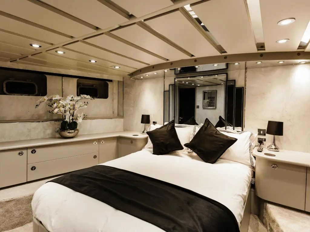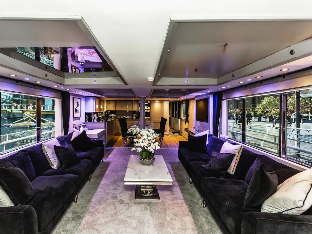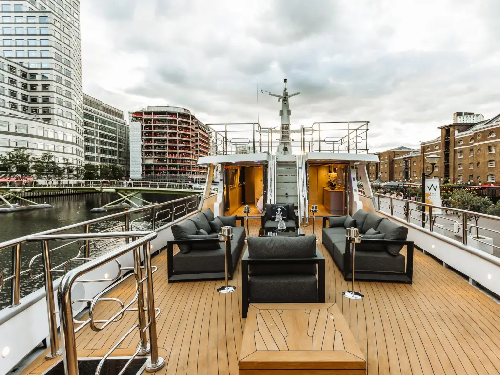 Luxury Yacht situated in Canary Wharf. The yacht is a multi use venue and is available to be hired for parties, conferences, small weddings, product launches, etc