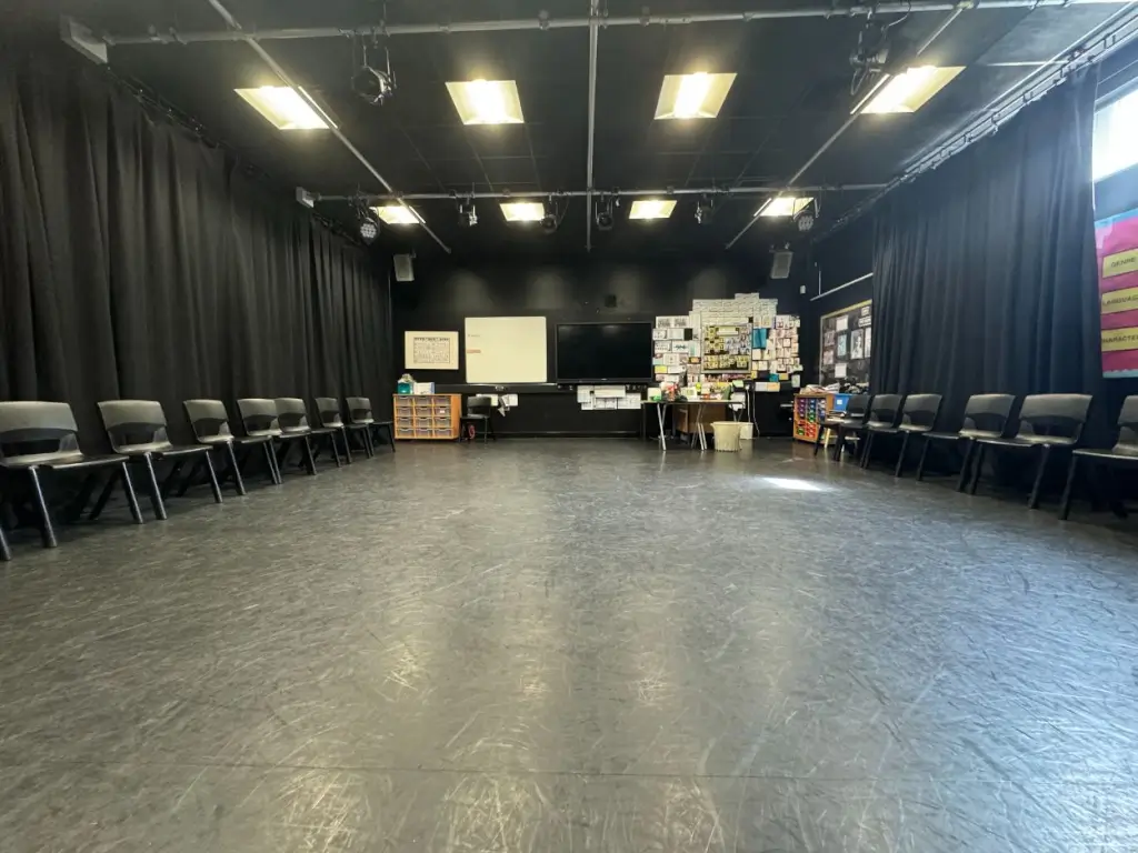 This drama studio is one of 3 at the school. Perfect for rehearsals, workshops, and small performances. The space is equipped with approximately 25 chairs and a TV that can be used for projecting presentations or video content. With its versatile setup, the studio is ideal for a range of creative activities and group sessions.