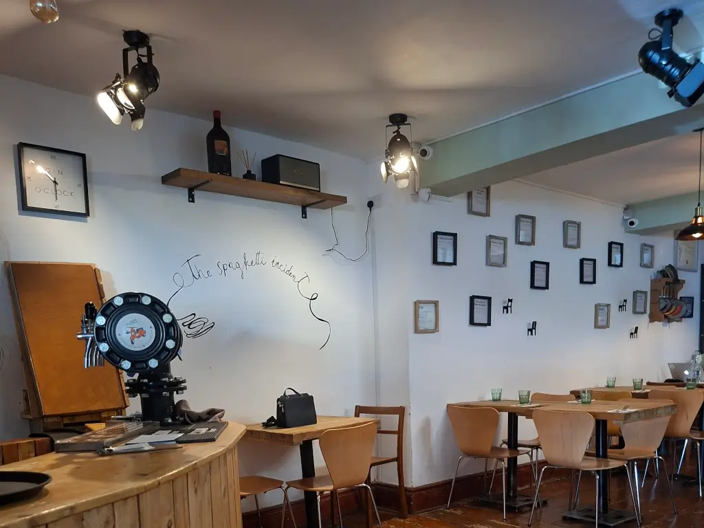 The restaurant features natural wooden walls, creating a warm and inviting ambiance. The rustic wooden furniture give it a simple yet carefully crafted look reminiscent of traditional Italian eateries.