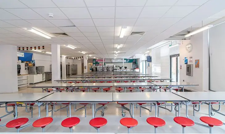 The Dining Hall is a spacious and bright space, with lunch tables with benches attached able to seat over 100 or to be hired as pictured with the tables cleared. It is a versatile space for large events.