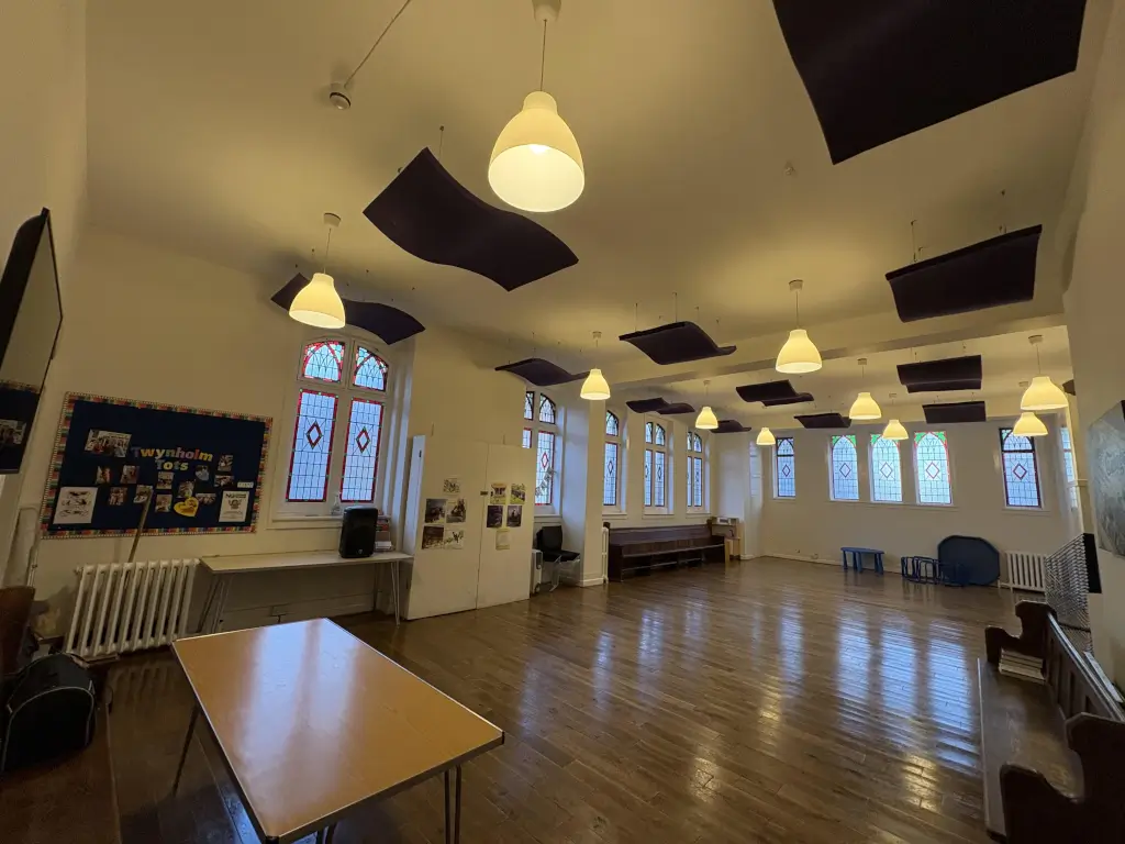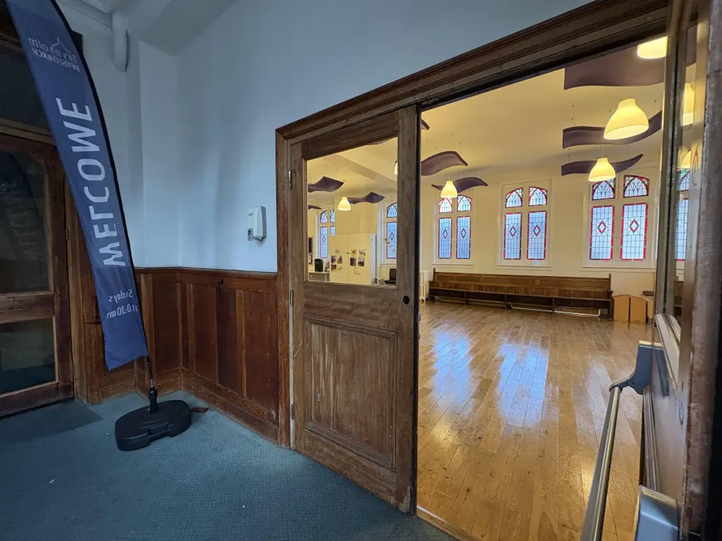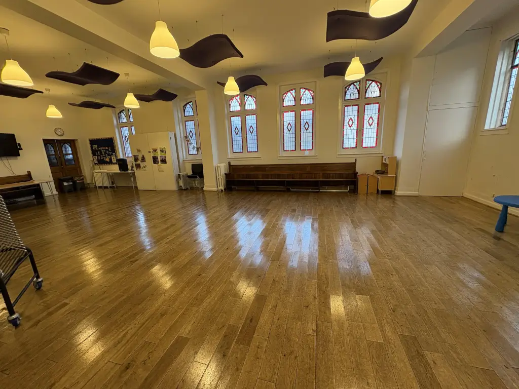 This space is a hall inside a church building, with capacity for 60(seated) to 80(total) people. There are on site toilets including a disabled toilet. Hall is at ground level with large double doors at front entrance. A small kitchen with dishwasher and oven is available immediately next to the hall. Chairs and tables are also available, included in rental fee.