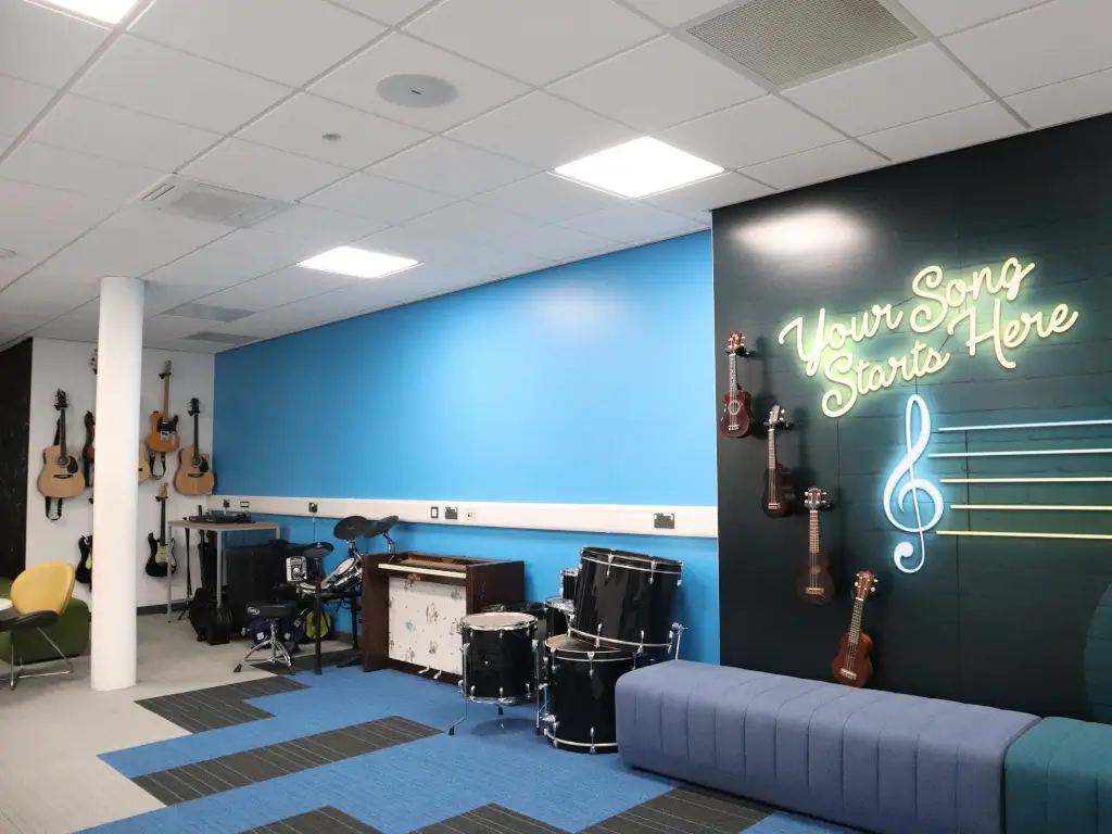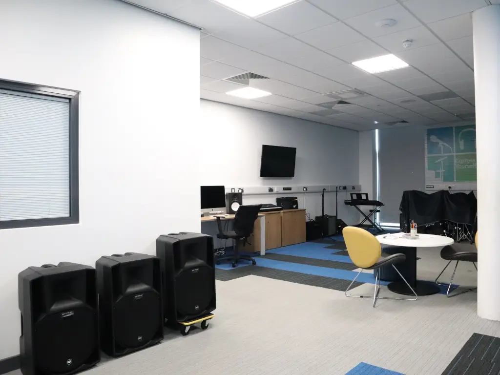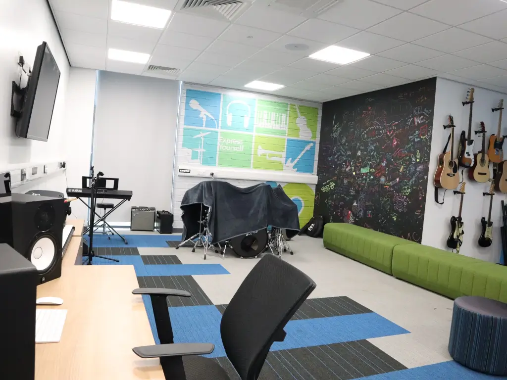 A music room suitable for tutoring or meetings.