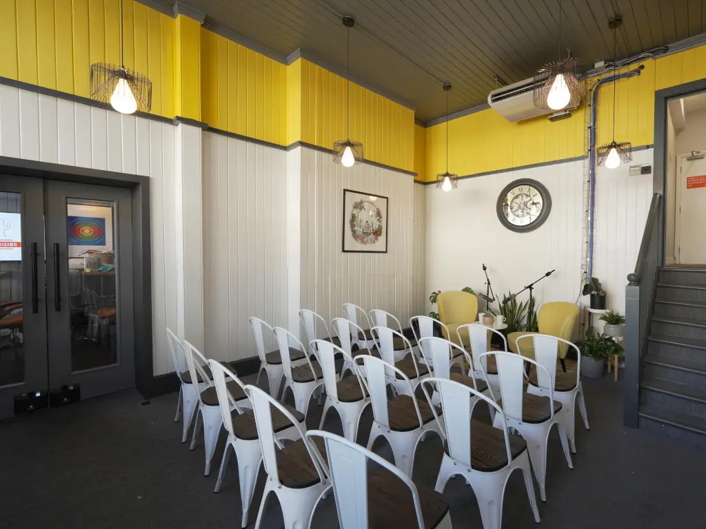 With capacity for up to 50 guests seated, the space can be tailored to your event’s needs, featuring options for stage setup, microphones, and a large screen for presentations or media. Whether you’re hosting a professional gathering or a lively creative event, our team can help configure the space to suit your vision.